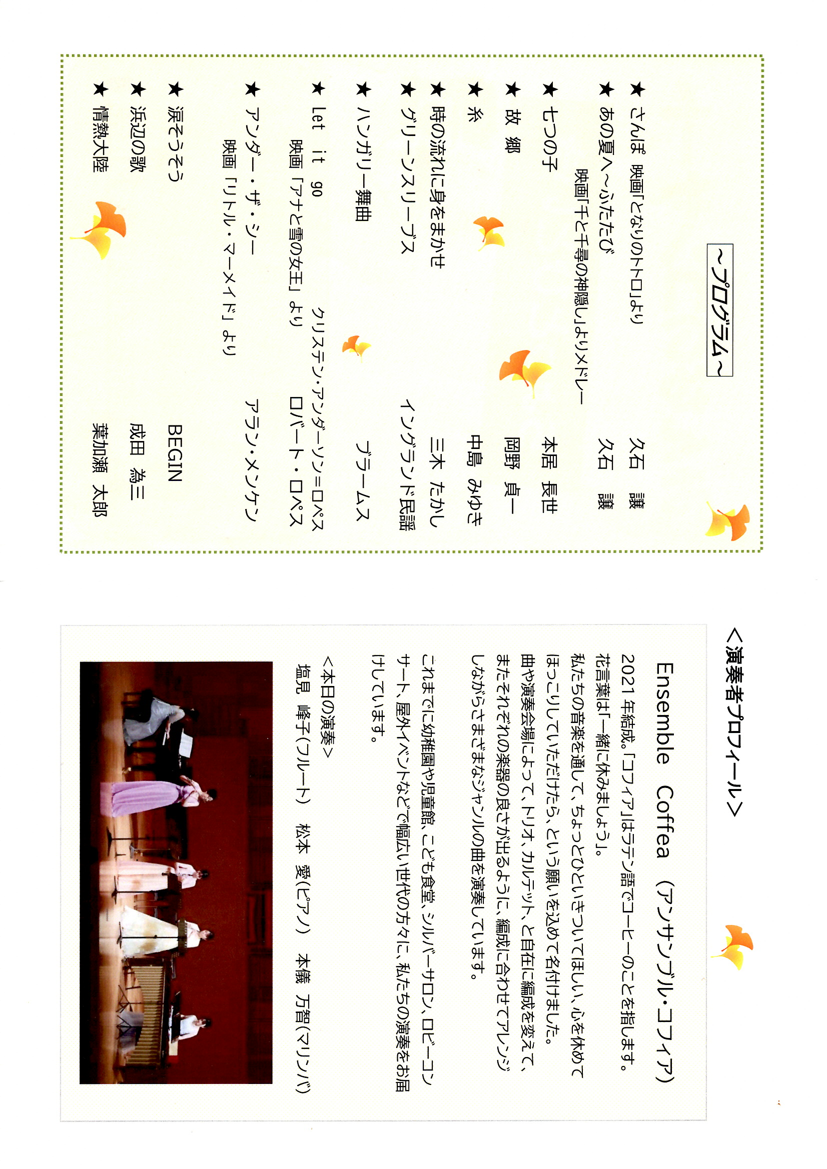 参加された方々は、いろんな演奏曲を聞かれて心を休めて、ほっこりしていただと思います。