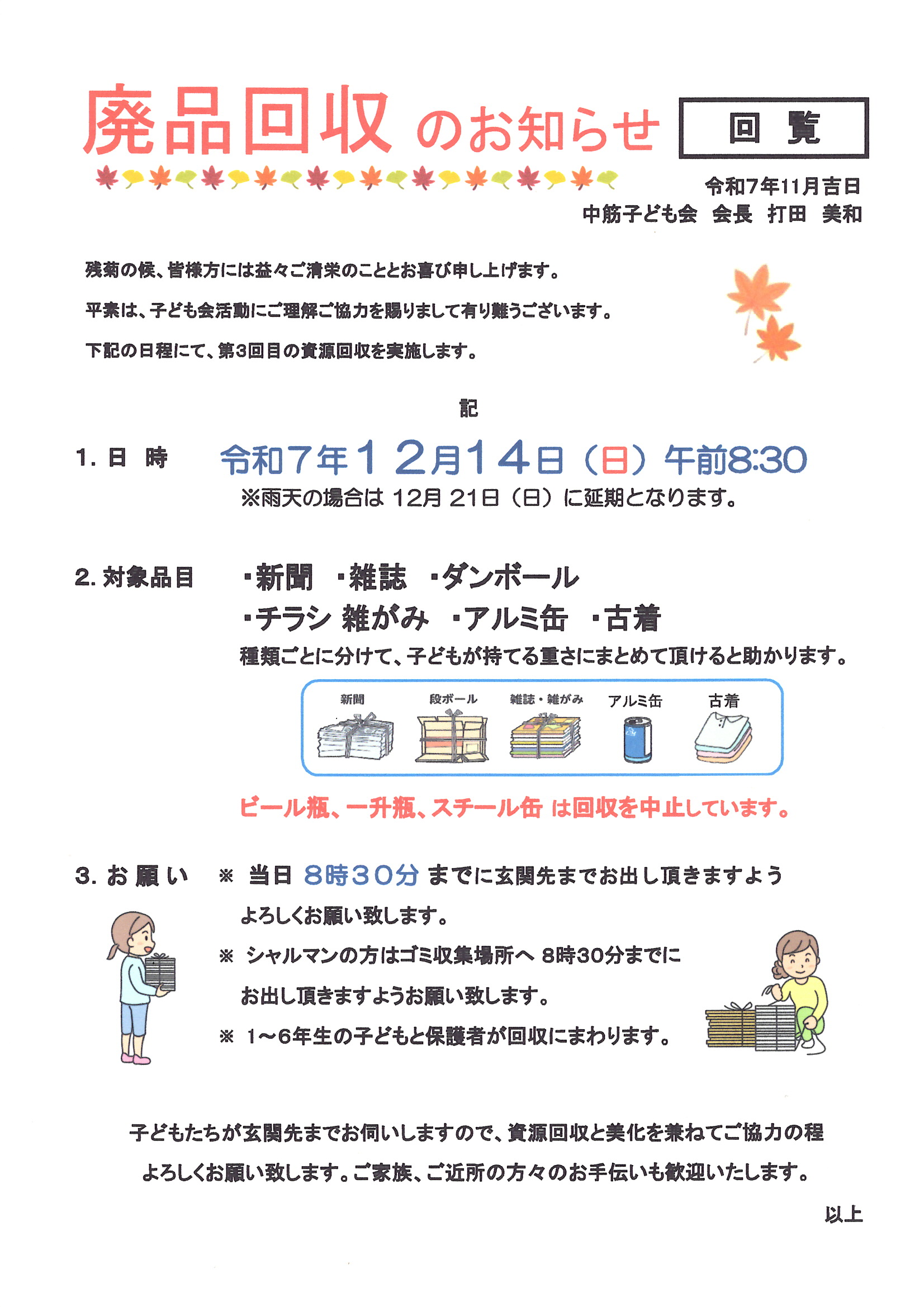 中筋子ども会 廃品回収のお知らせ(12/14)