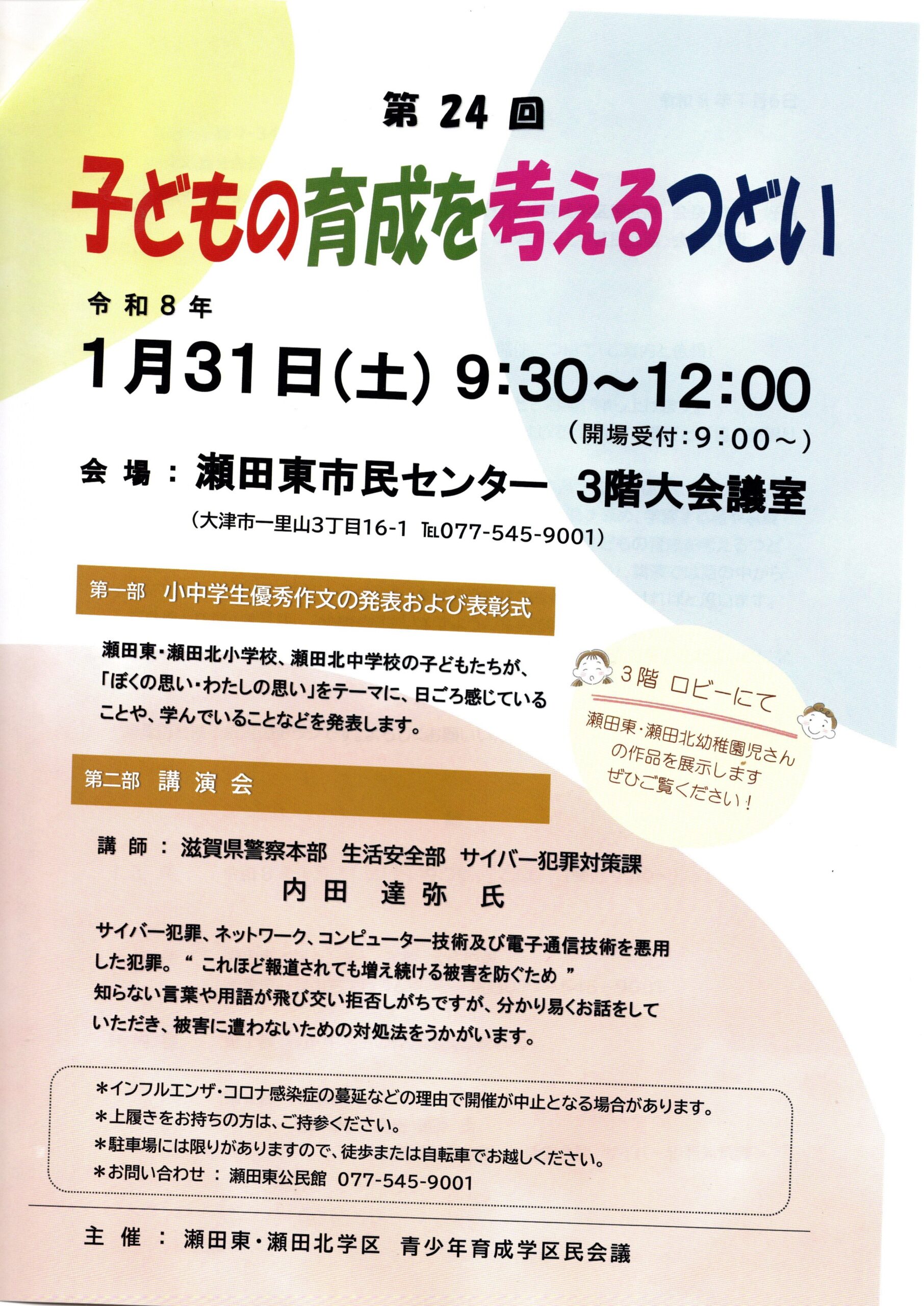 瀬田北学区自治連合会からのお知らせ 2026.01.06New 子どもの育成を考えるつどい のお知らせ 2025.12.21 ロマンス詐欺 💛 偽警官詐欺が急増してます ❕ 相談専用電話窓口 ♯9110まで連絡 一旦振り込まれますと、返ってきません 家族や知り合いに相談、いったん冷静に・・・。 2025.12.21 12月20日 地域一斉清掃ご苦労様でした。 他一覧はこちらから